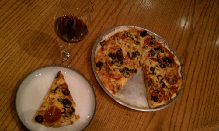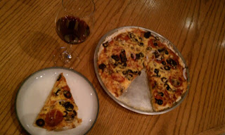 tonight i made a great homemade pizza dough and topped it with our favorite things. although we will eat it seperately it was truly delicious when i ate it and again when he ate it.