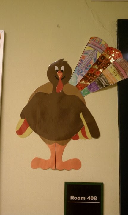 I added Henry the Turkey to my Thanksgiving Wall this year. Each child did a feather as a homework assignment and wrote on it something they were thankful for. I laminated Henry so I can use him again and again.