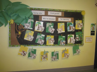 This is a project I send home at Parent Orientation. At first there are just generic monkey die cuts hanging from the twine clotheslines. Then as the parents submit their palm trees and on the first day of school the students complete their monkeys they get put on paper together. The parents write on the trunk of their palm tree 3-4 things they love about their First Grader. They turn out fantastic.