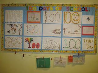 A week before the 100th day I send home our homework bags with a large white piece of paper 11X17 and all the directions they get are to “Create a piece of art from 100 of an item.” And I give a few examples like… pasta, cotton balls, candy etc.