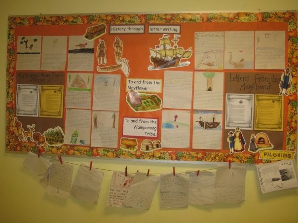 The main bulletin board has letters that the First Graders wrote to a Pilgrim Girl and Wampanoag Boy. Scholastic sends me 3 letters from each throughout the month of November and we write back in response. We use new vocabulary and also a formal letter writing greeting and salutation.